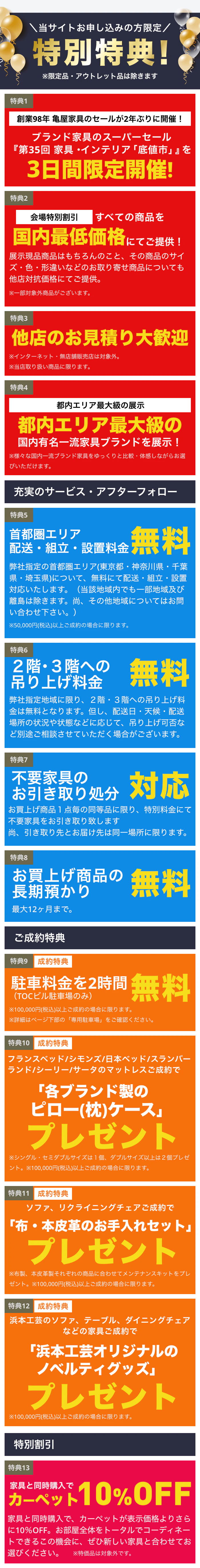 | 専用駐車場 | 「TOC駐車場」に限り、税込10万円以上ご成約の方に、駐車料金を最大2時間無料サービス致します。 ※イベント会場「TOCビル」の「TOC駐車場」に限ります。 ※他の駐車場についての駐車料金を無料サービスは行っておりませんので、ご注意ください。詳細についてはお問い合わせください。 |