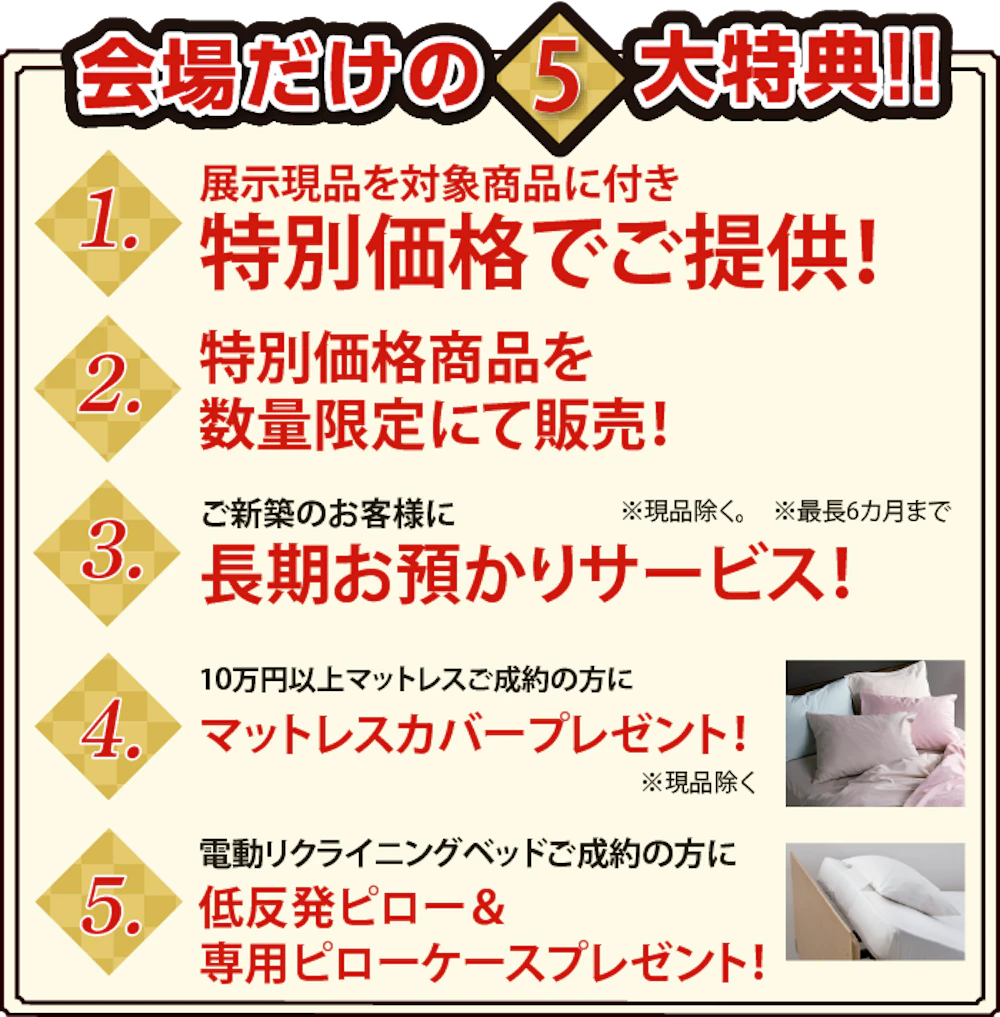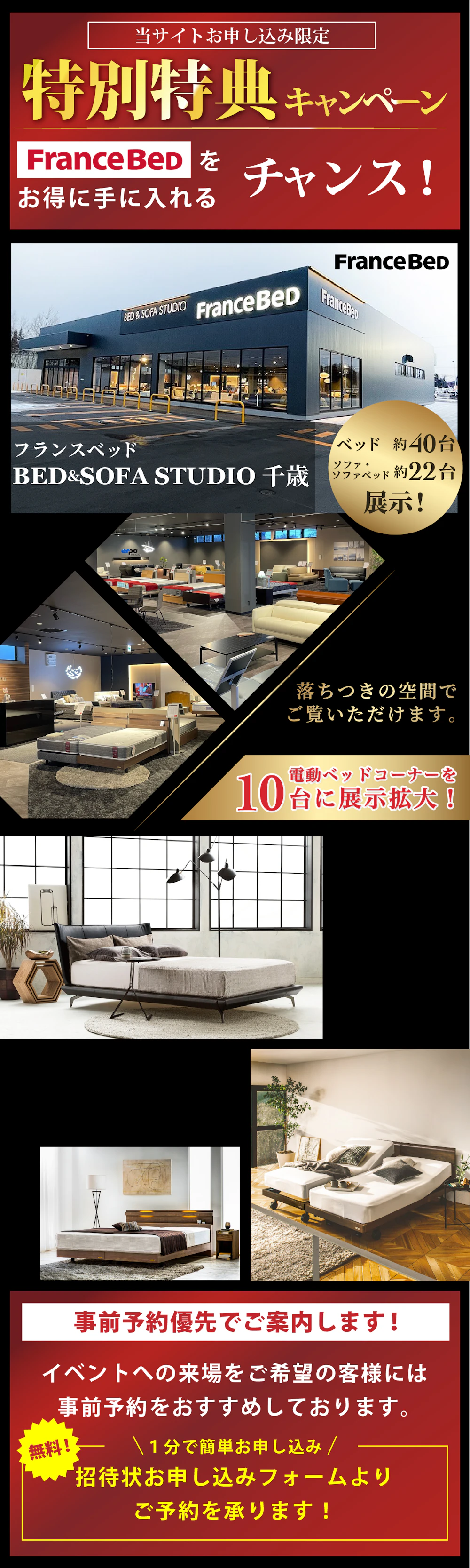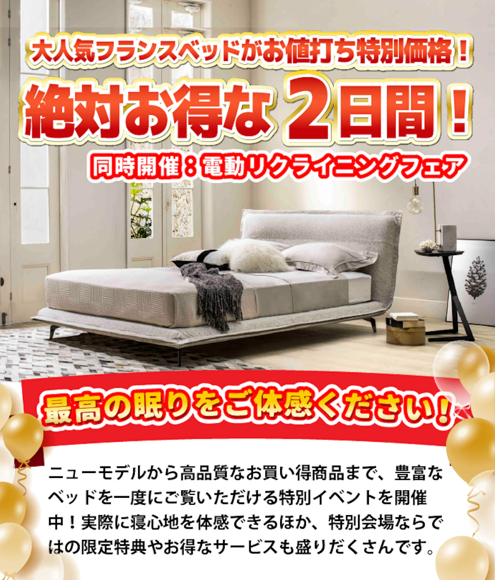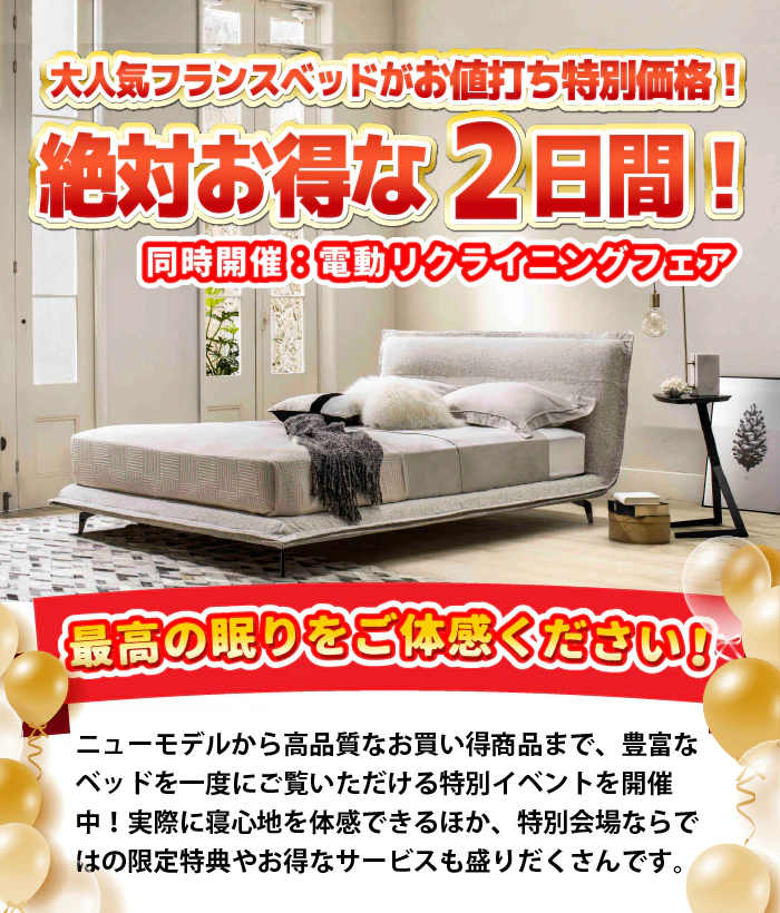 一流ベッドブランドである、フランスベッドのすべてのマットレス・ベッドフレーム・電動リクライニングベッド・羽毛布団・寝装品を「イベント限定の特別価格」にてご提供!