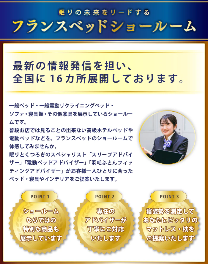 「スリープアドバイザー」や「電動ベッドアドバイザー」を保有している眠りのプロがお客様を専任でご案内させていただきます。