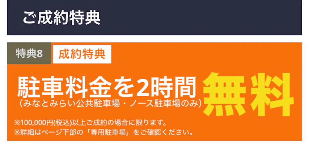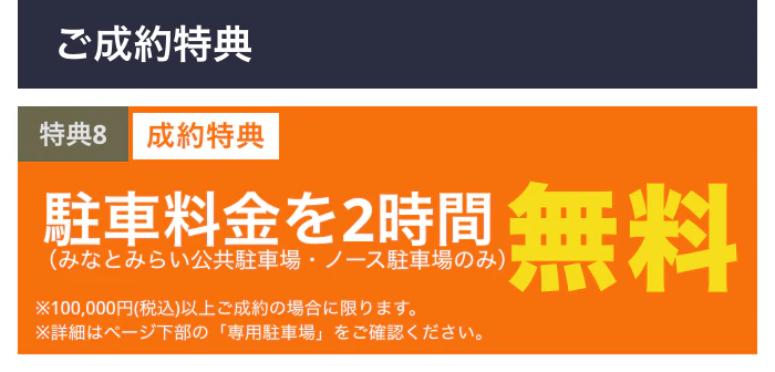 「みなとみらい公共駐車場・ノース駐車場」に限り、税込10万円以上ご成約の方に、駐車料金を最大2時間無料サービス致します。